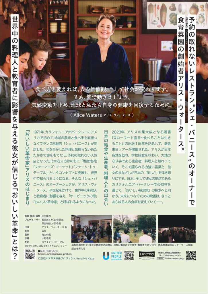 世界中の料理人と教育者に影響を与えた料理人であり思想家、アリス・ウォータースが、2023 年秋に日本を訪れました。 来日プロジェクトチームは、アリスと共に、この日本でスローフードを実践する人々を訪ね歩く中で、「この機会を自分たちだけで独り占めしてはもったいない」と考えるようになりました。アリスが日本を旅するなかで見たもの、聞いたこと、味わったもの、気づいたことを余すところなく記録し、観る人の五感に響く映像を作りたい。そして、アリスの思想や、各地域での実践を次世代に繋ぐことができたら・・・ 本作品は、そんな願いから、クラウドファウンディングによって592人から支援され、完成したものです。