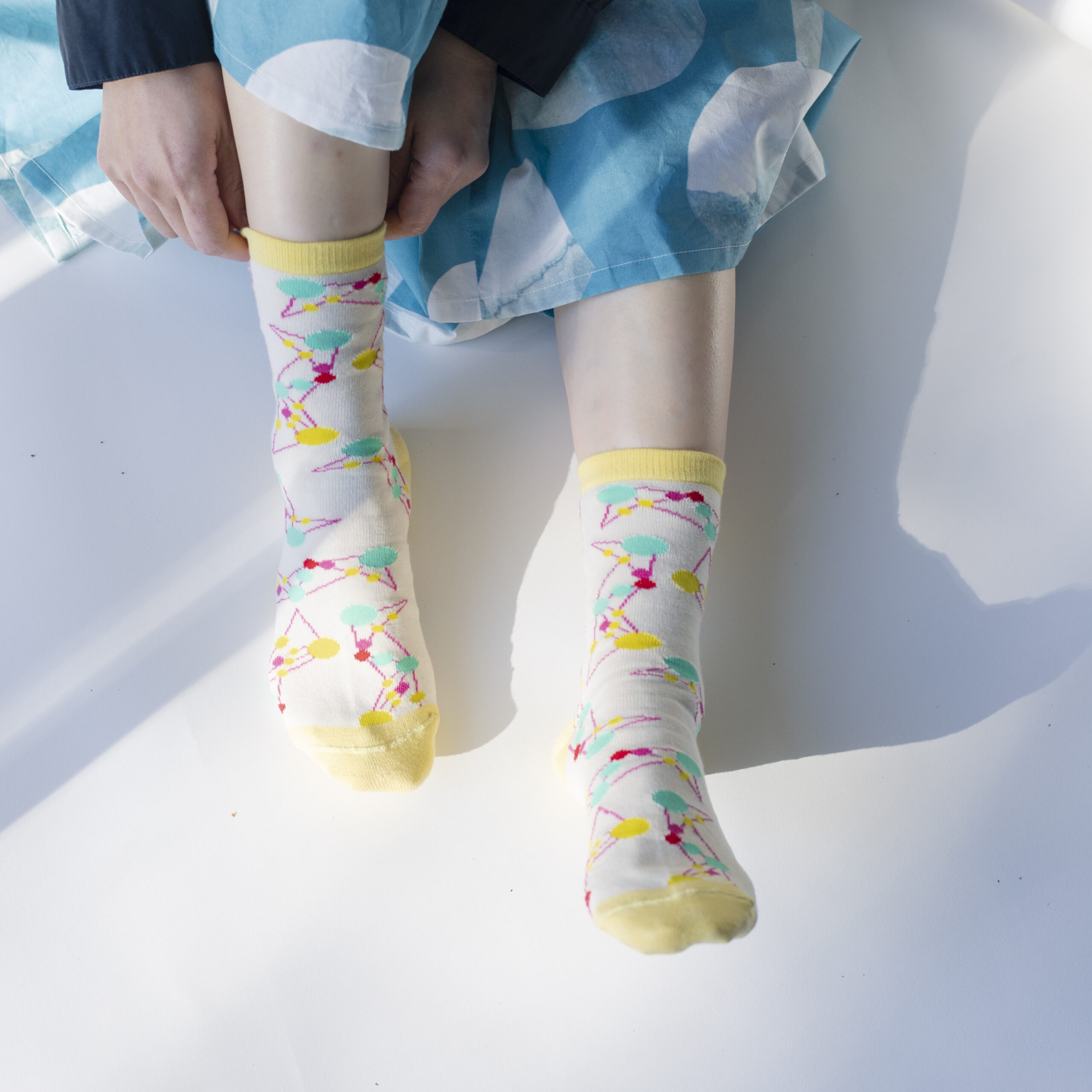 原画をパターン化して編み上げたクルーソックス